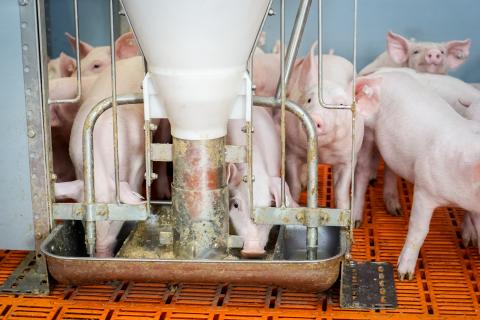 Wir füttern unsere Schweine bedarfsgerechter als uns selbst. Wie schon erwähnt, sind sie zwar Allesfresser, wir versorgen sie aber je nach Größe, Gewicht und Leistungsbedarf mit speziell abgestimmten Futtermitteln mit Getreide – wie Weizen, Gerste, Mais – sowie Soja, Raps, Mineralien und Aminosäuren. Ihre Futterration bekommen sie von uns drei- bis viermal täglich. Alternativ geben wir unseren Schweinen auch die Möglichkeit nach ihren eigenen Bedürfnissen – quasi auf Knopfdruck – zu fressen, wann immer sie es wollen. Hier hat sich der Begriff ad libitum-Fütterung etabliert. Auch Ferkel erhalten ihr besonders energie- und eiweißreiches Futter ad libitum. Wie auch für uns Menschen gilt: ausreichend viel trinken ist wichtig. Dafür haben wir viele Tränken in unseren Ställen aufgebaut, an denen unsere Schweine rund um die Uhr trinken können. Und das ist nicht wenig! Ein Mastschwein trinkt am Tag 6 bis 10 l Wasser, eine Zuchtsau sogar 15 bis 40 l.
